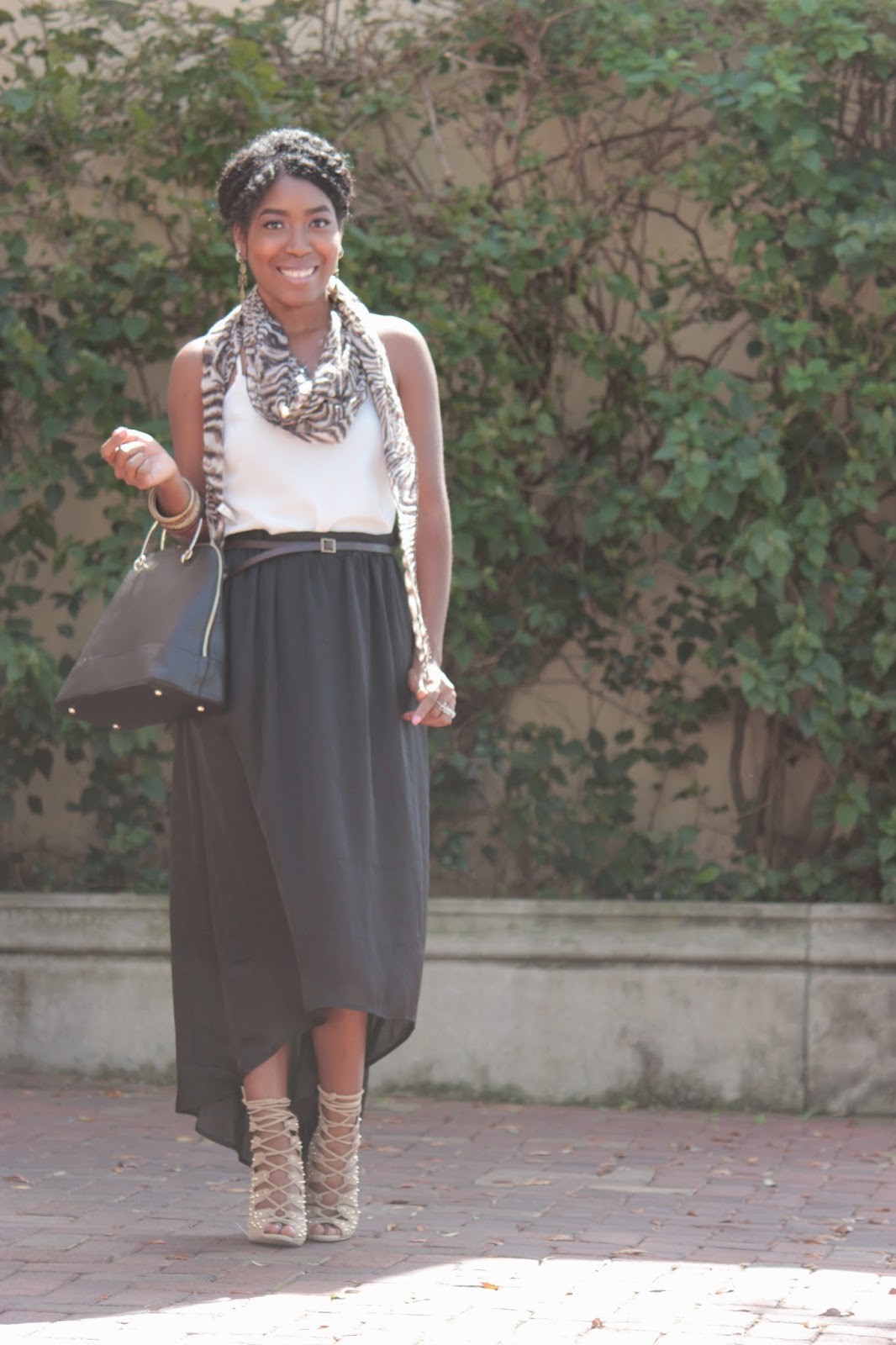 White Cami J.Crew Factory here/black maxi skirt (old) similar here/purse Optimist Just Fab here/heels Reanne Just Fab here/ Earrings JewelMint here/scarf Macy's (old) similar here.