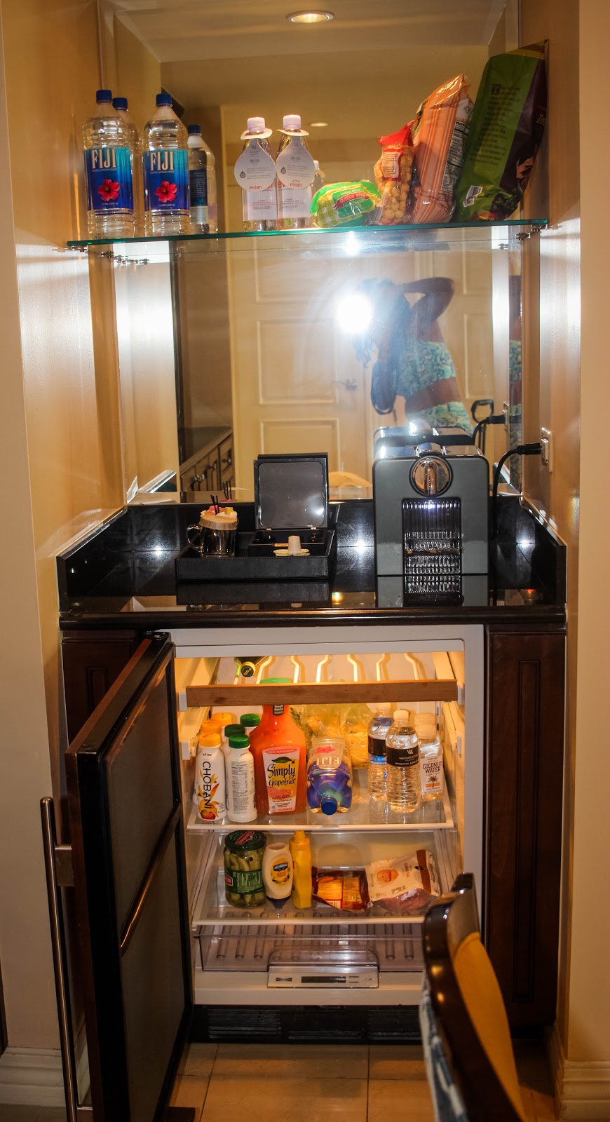So as you can see, in our suite its fully stocked. These are photos from our last trip to Bonnet Creek by the way. I usually do this before I get to the hotel. So I will get things that do not need to be cooled ie.; water, chips, bread etc and we bring that on the ride up. Then I find the nearest Publix or Whole Foods Market and I get the rest of my groceries from breakfast to dinner. How do we transport this? I bought a wagon that is completely compatible and all of these groceries fit inside it as well as my purse, blanket, wine, and anything else I am bringing. As a Celiac pre-planning meals is a must so I don't get stuck with no options, but this is also great if you want to save money while on vacation. Let's be honest, $25.00 for an omelette is outrageous and $18.00 for a grilled chicken Cesar salad is even more outrageous. So if you pre-plan you will save a ton of money.