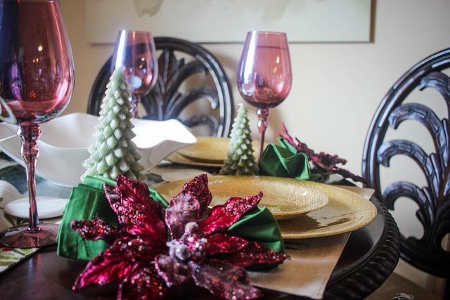 So this is this year's holiday table. I have just as much on the table as I always do, but for some reason it seems less cluttered. Maybe because my center piece is tall as well as the wine goblets. These cute Christmas trees are made of wax and I can wrap them up and re-use them next year even if for home decorations, they also come in white. It's always exciting for me to do these table settings and just admire them daily. I hope you all enjoy!
