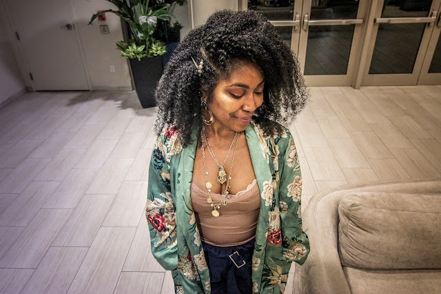 When looking to re-style items from my closet I first look at the color palettes that are most popular for the season. This is the third time I have worn this kimono, but the first time in the Fall. Did you know mint or sage can be a great transitional color for any season? Tonight's look plays up dark moody colors that mimic overcast Fall days. When looking to re-style an item focus on the main item and then build out from there once you have your colors in mind. I like to add new accessories or one new clothing item just in case none of the older items are for sale anymore.