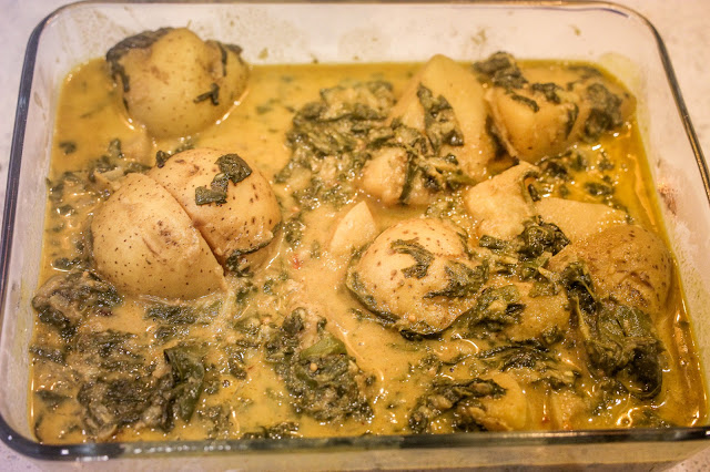 - Add the potato, garlic, turmeric, ginger powder, chilli powder,, mustard seeds, curry powder and garam masala and fry until the potato starts to soften.