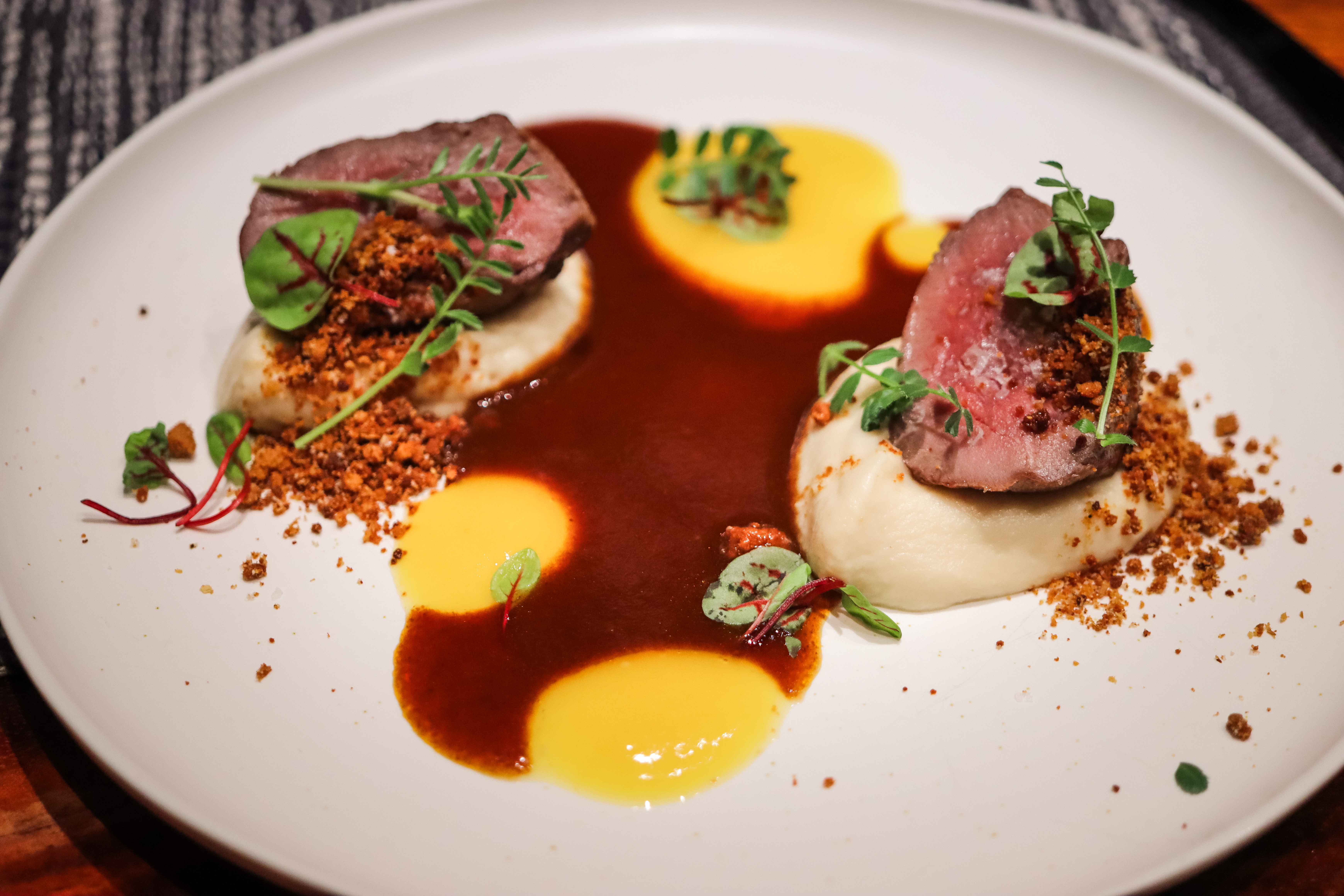 CELERY ROOT, GOOSEBERRIES, DEMI-GLACE, BROWN BUTTER CRUMBLE.